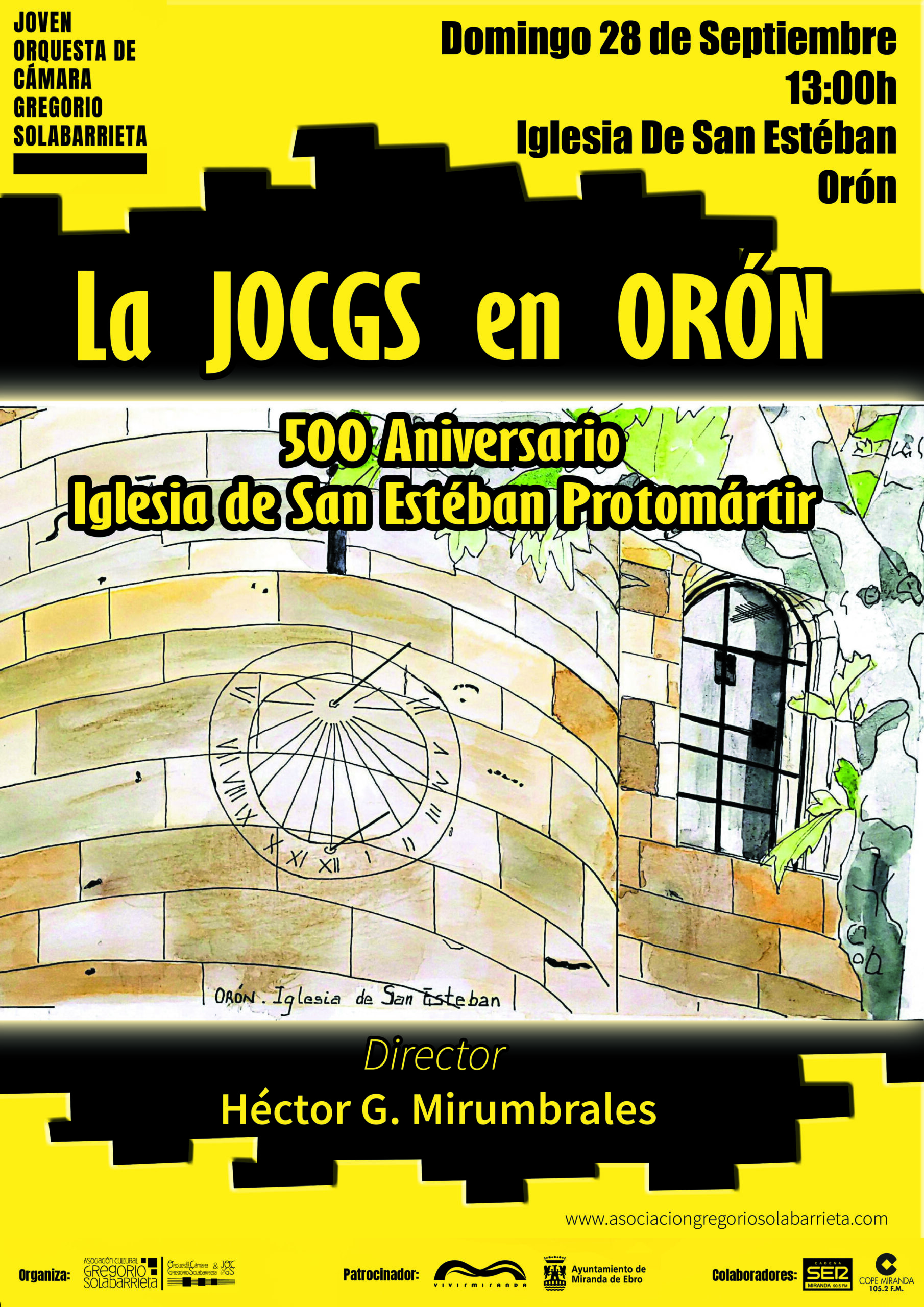 La Joven Orquesta de Cámara Gregorio Solabarrieta (JOCGS) te invita a un concierto extraordinario para conmemorar el 500 aniversario de la Iglesia de San Esteban Protomártir de Orón. El próximo domingo 28 de septiembre a las 13:00 horas, la majestuosa nave de este templo histórico se llenará de las melodías más evocadoras del cine y el teatro, en una cita pensada para emocionar y unir a vecinos y visitantes.